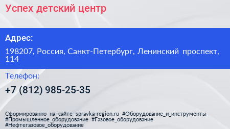 Успех, детский центр по адресу 198207, Россия, Санкт-Петербург, Ленинский проспект, 114 в дальнейшем Организация, размещена в следующих категориях: