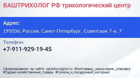 ВАШТРИХОЛОГ.РФ, трихологический центр по адресу 191036, Россия, Санкт-Петербург, Советская 7-я, 7 в дальнейшем Организация, размещена в следующих категориях:
