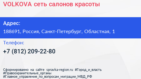VOLKOVA, сеть салонов красоты по адресу 188691, Россия, Санкт-Петербург, Областная, 1 в дальнейшем Организация, размещена в следующих категориях: