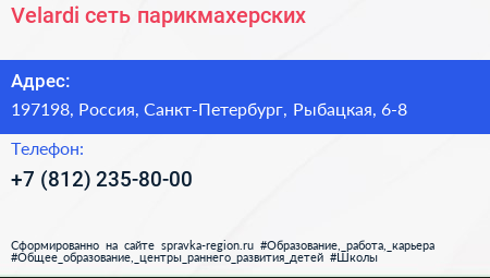 Velardi, сеть парикмахерских по адресу 197198, Россия, Санкт-Петербург, Рыбацкая, 6-8 в дальнейшем Организация, размещена в следующих категориях: