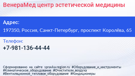 ВенераМед, центр эстетической медицины по адресу 197350, Россия, Санкт-Петербург, проспект Королёва, 65 в дальнейшем Организация, размещена в следующих категориях: