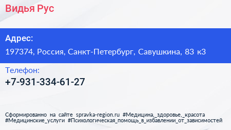 Видья Рус по адресу 197374, Россия, Санкт-Петербург, Савушкина, 83 к3 в дальнейшем Организация, размещена в следующих категориях: