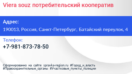 Viera-souz, потребительский кооператив по адресу 190013, Россия, Санкт-Петербург, Батайский переулок, 4 в дальнейшем Организация, размещена в следующих категориях: