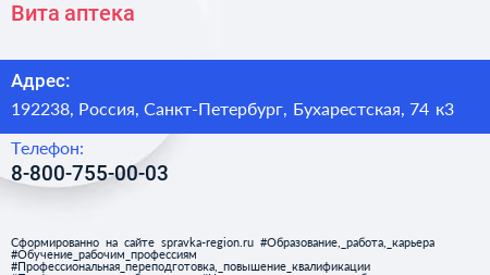 Вита, аптека по адресу 192238, Россия, Санкт-Петербург, Бухарестская, 74 к3 в дальнейшем Организация, размещена в следующих категориях: