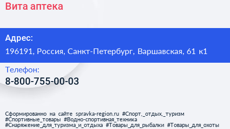 Вита, аптека по адресу 196191, Россия, Санкт-Петербург, Варшавская, 61 к1 в дальнейшем Организация, размещена в следующих категориях:
