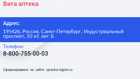Вита, аптека по адресу 195426, Россия, Санкт-Петербург, Индустриальный проспект, 10 к1 лит Б в дальнейшем Организация, размещена в следующих категориях: