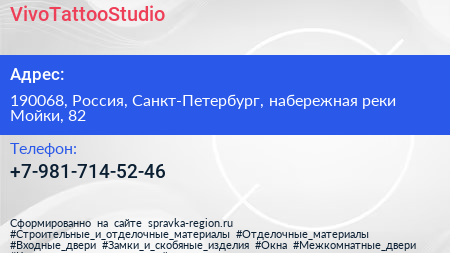 VivoTattooStudio по адресу 190068, Россия, Санкт-Петербург, набережная реки Мойки, 82 в дальнейшем Организация, размещена в следующих категориях: