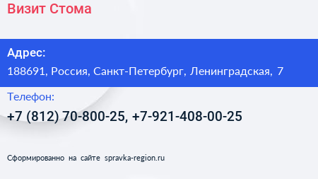 Визит Стома по адресу 188691, Россия, Санкт-Петербург, Ленинградская, 7 в дальнейшем Организация, размещена в следующих категориях: