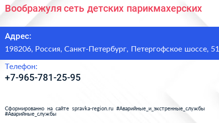 Воображуля, сеть детских парикмахерских по адресу 198206, Россия, Санкт-Петербург, Петергофское шоссе, 51 в дальнейшем Организация, размещена в следующих категориях: