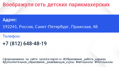 Воображуля, сеть детских парикмахерских по адресу 192241, Россия, Санкт-Петербург, Пражская, 48 в дальнейшем Организация, размещена в следующих категориях: