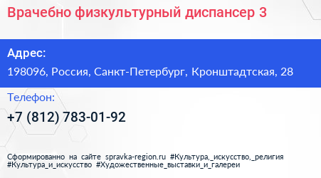 Врачебно-физкультурный диспансер №3 по адресу 198096, Россия, Санкт-Петербург, Кронштадтская, 28 в дальнейшем Организация, размещена в следующих категориях: