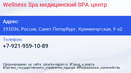 Wellness Spa, медицинский SPA-центр по адресу 191036, Россия, Санкт-Петербург, Кременчугская, 9 к2 в дальнейшем Организация, размещена в следующих категориях: