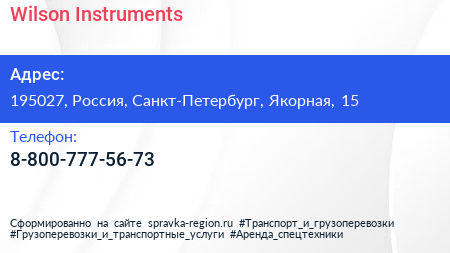 Wilson Instruments по адресу 195027, Россия, Санкт-Петербург, Якорная, 15 в дальнейшем Организация, размещена в следующих категориях: