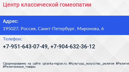 Центр классической гомеопатии по адресу 195027, Россия, Санкт-Петербург, Миронова, 6 в дальнейшем Организация, размещена в следующих категориях: