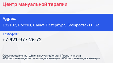 Центр мануальной терапии по адресу 192102, Россия, Санкт-Петербург, Бухарестская, 32 в дальнейшем Организация, размещена в следующих категориях: