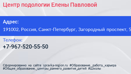 Центр подологии Елены Павловой по адресу 191002, Россия, Санкт-Петербург, Загородный проспект, 5 в дальнейшем Организация, размещена в следующих категориях: