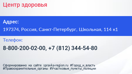 Центр здоровья по адресу 197374, Россия, Санкт-Петербург, Школьная, 114 к1 в дальнейшем Организация, размещена в следующих категориях: