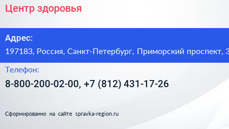 Центр здоровья по адресу 197183, Россия, Санкт-Петербург, Приморский проспект, 3 в дальнейшем Организация, размещена в следующих категориях: