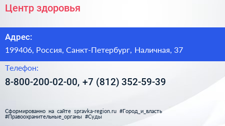 Центр здоровья по адресу 199406, Россия, Санкт-Петербург, Наличная, 37 в дальнейшем Организация, размещена в следующих категориях: