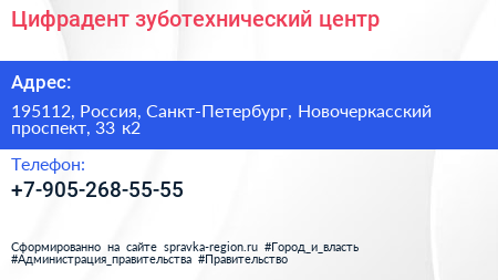Цифрадент, зуботехнический центр по адресу 195112, Россия, Санкт-Петербург, Новочеркасский проспект, 33 к2 в дальнейшем Организация, размещена в следующих категориях: