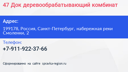 47 Док, деревообрабатывающий комбинат по адресу 199178, Россия, Санкт-Петербург, набережная реки Смоленки, 2 в дальнейшем Организация, размещена в следующих категориях: