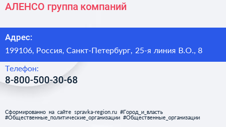 АЛЕНСО, группа компаний по адресу 199106, Россия, Санкт-Петербург, 25-я линия В.О., 8 в дальнейшем Организация, размещена в следующих категориях: