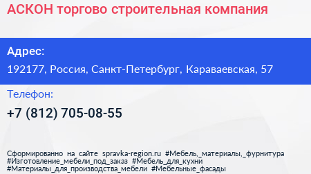 АСКОН, торгово-строительная компания по адресу 192177, Россия, Санкт-Петербург, Караваевская, 57 в дальнейшем Организация, размещена в следующих категориях: