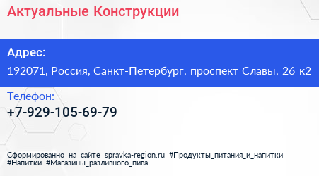 Актуальные Конструкции по адресу 192071, Россия, Санкт-Петербург, проспект Славы, 26 к2 в дальнейшем Организация, размещена в следующих категориях:
