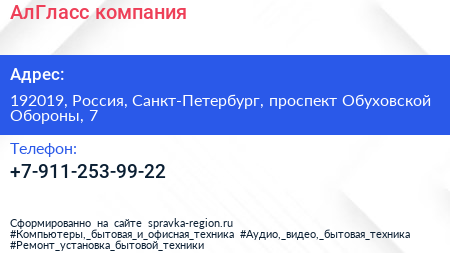 АлГласс, компания по адресу 192019, Россия, Санкт-Петербург, проспект Обуховской Обороны, 7 в дальнейшем Организация, размещена в следующих категориях: