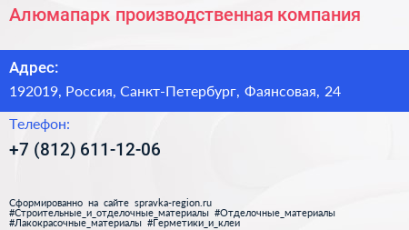 Алюмапарк, производственная компания по адресу 192019, Россия, Санкт-Петербург, Фаянсовая, 24 в дальнейшем Организация, размещена в следующих категориях: