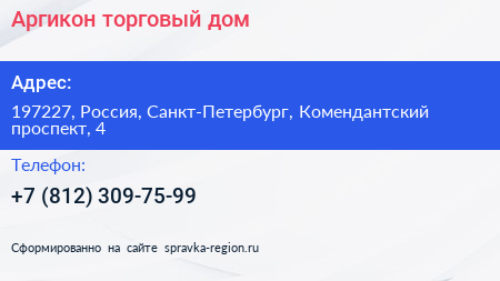 Аргикон, торговый дом по адресу 197227, Россия, Санкт-Петербург, Комендантский проспект, 4 в дальнейшем Организация, размещена в следующих категориях: