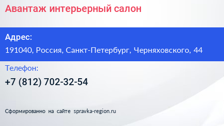 Авантаж, интерьерный салон по адресу 191040, Россия, Санкт-Петербург, Черняховского, 44 в дальнейшем Организация, размещена в следующих категориях: