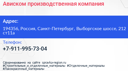 Ависком, производственная компания по адресу 194356, Россия, Санкт-Петербург, Выборгское шоссе, 212 ст11а в дальнейшем Организация, размещена в следующих категориях: