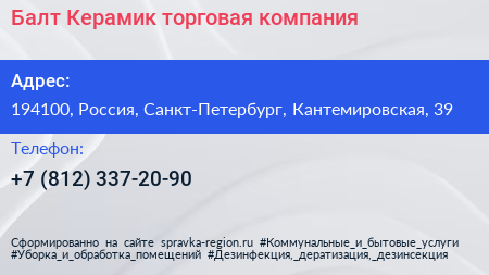Балт Керамик, торговая компания по адресу 194100, Россия, Санкт-Петербург, Кантемировская, 39 в дальнейшем Организация, размещена в следующих категориях: