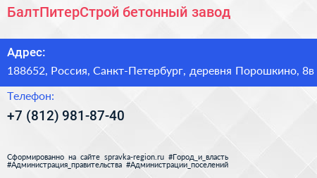 БалтПитерСтрой, бетонный завод по адресу 188652, Россия, Санкт-Петербург, деревня Порошкино, 8в в дальнейшем Организация, размещена в следующих категориях:
