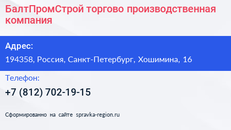 БалтПромСтрой, торгово-производственная компания по адресу 194358, Россия, Санкт-Петербург, Хошимина, 16 в дальнейшем Организация, размещена в следующих категориях: