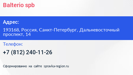 Balterio-spb по адресу 193168, Россия, Санкт-Петербург, Дальневосточный проспект, 14 в дальнейшем Организация, размещена в следующих категориях: