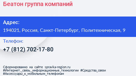 Беатон, группа компаний по адресу 194021, Россия, Санкт-Петербург, Политехническая, 9 в дальнейшем Организация, размещена в следующих категориях: