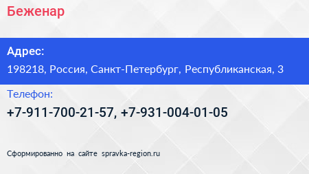Беженар по адресу 198218, Россия, Санкт-Петербург, Республиканская, 3 в дальнейшем Организация, размещена в следующих категориях: