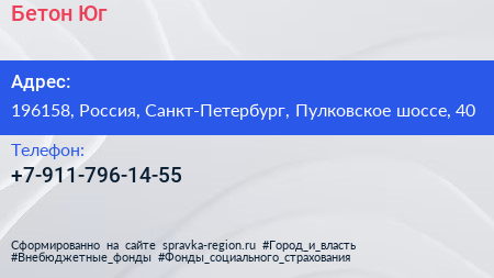 Бетон Юг по адресу 196158, Россия, Санкт-Петербург, Пулковское шоссе, 40 в дальнейшем Организация, размещена в следующих категориях: