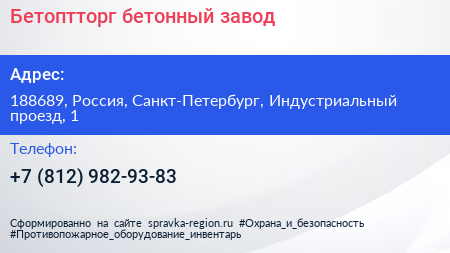 Бетоптторг, бетонный завод по адресу 188689, Россия, Санкт-Петербург, Индустриальный проезд, 1 в дальнейшем Организация, размещена в следующих категориях: