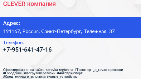 CLEVER, компания по адресу 191167, Россия, Санкт-Петербург, Тележная, 37 в дальнейшем Организация, размещена в следующих категориях: