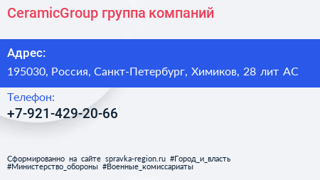 CeramicGroup, группа компаний по адресу 195030, Россия, Санкт-Петербург, Химиков, 28 лит АС в дальнейшем Организация, размещена в следующих категориях: