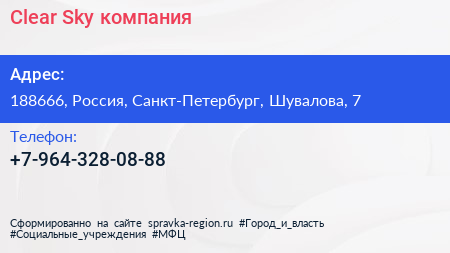 Clear Sky, компания по адресу 188666, Россия, Санкт-Петербург, Шувалова, 7 в дальнейшем Организация, размещена в следующих категориях:
