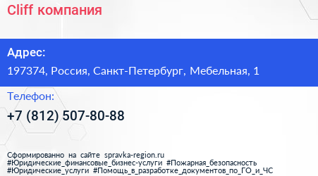 Cliff, компания по адресу 197374, Россия, Санкт-Петербург, Мебельная, 1 в дальнейшем Организация, размещена в следующих категориях: