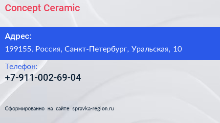 Concept Ceramic по адресу 199155, Россия, Санкт-Петербург, Уральская, 10 в дальнейшем Организация, размещена в следующих категориях: