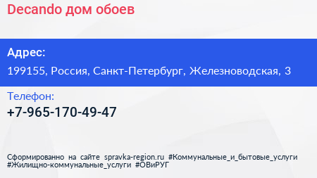 Decando, дом обоев по адресу 199155, Россия, Санкт-Петербург, Железноводская, 3 в дальнейшем Организация, размещена в следующих категориях: