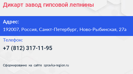 Дикарт, завод гипсовой лепнины по адресу 192007, Россия, Санкт-Петербург, Ново-Рыбинская, 27а в дальнейшем Организация, размещена в следующих категориях: