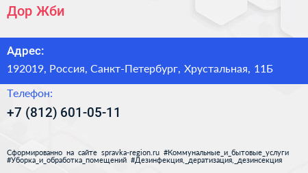 Дор Жби по адресу 192019, Россия, Санкт-Петербург, Хрустальная, 11Б в дальнейшем Организация, размещена в следующих категориях: