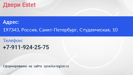 Двери Estet по адресу 197343, Россия, Санкт-Петербург, Студенческая, 10 в дальнейшем Организация, размещена в следующих категориях: